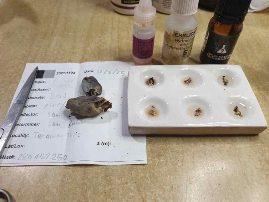 When we tested the Psilocybe weraroa it didn’t react at all, either from the skin, gleba (inside of the pouch), or the stalk. We only have the one sample to work with though, so it could be that we got a specimen that didn’t react to the reagent and others may react.