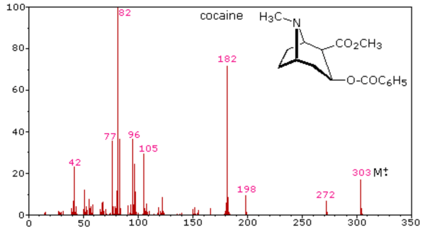 Mass spectrum of cocaine. Each peak represents a different fragment of the molecule. Image retrieved from Chemistry Libretexts.
