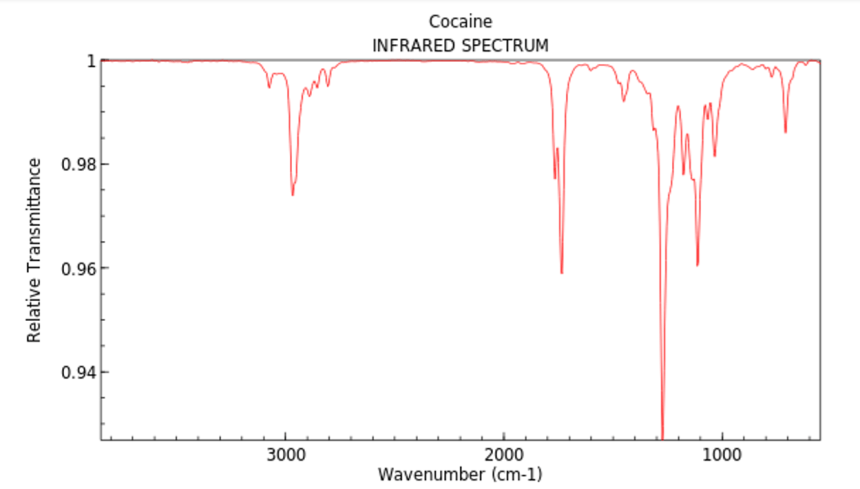 Cocaine FTIR spectrum. Each peak represents vibrations of a different chemical bond.