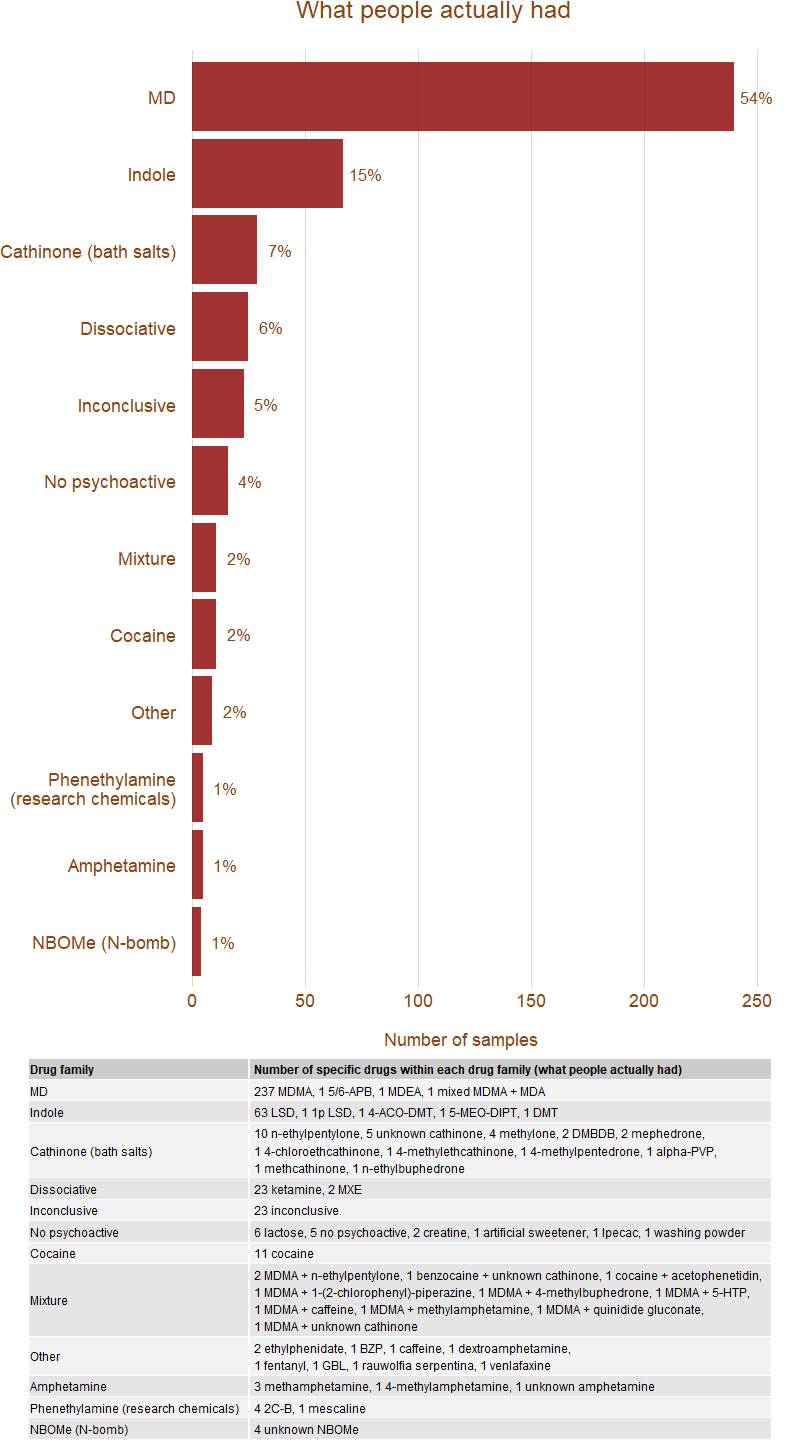 * A very small number of samples in the MD or indole family that were not MDMA or LSD were included in this group.