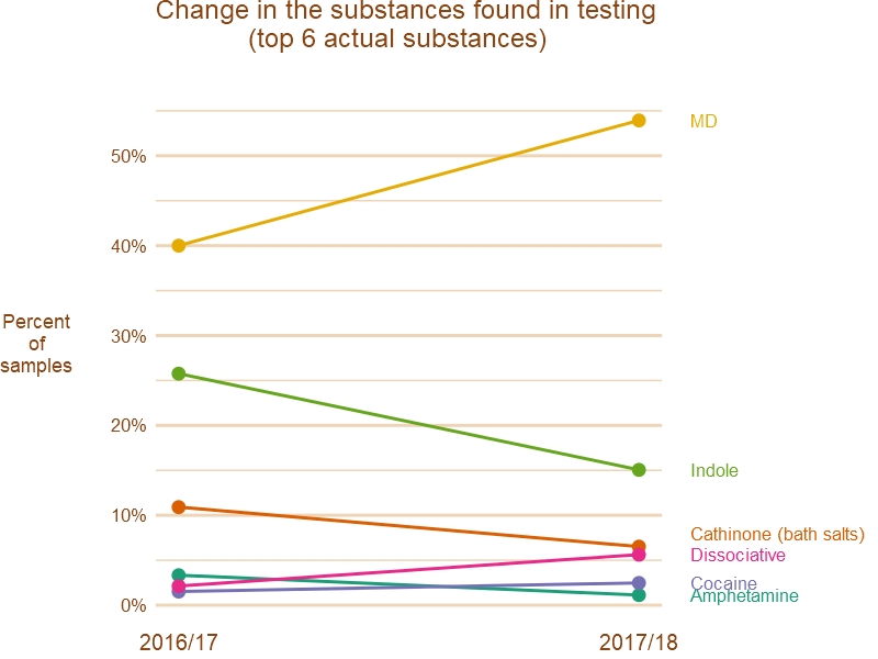 There was an increase in the overall proportion of MDMA from 40% to 54%. This results from an increase in the amount of presumed MDMA that was brought to us, and from the increase in the proportion that actually were MDMA. Also consistent with this increase was a decrease in the proportion of samples that turned out to be cathinones, from 11 to 7%, cathinones being a common substitute for MDMA.