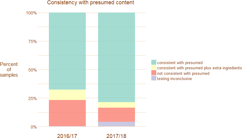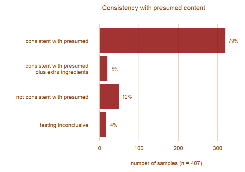 We saw a marked increase in the proportion of substances that were what people thought they were – from 68 to 79%. This is in part, but not fully accounted for by the reduction in the proportion that were as presumed but had extra ingredients (from 9-5%), which we believe results largely from improvements in our testing method.