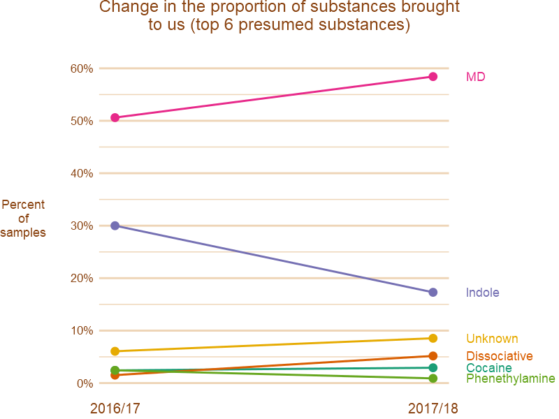 The proportion of samples that were as the client presumed increased for both of our main substances, MD (MDMA, MDEA or MDA) and indoles (usually LSD). Of particular note is the proportion of MDMA that was as presumed, which increased from 63 to 83%.