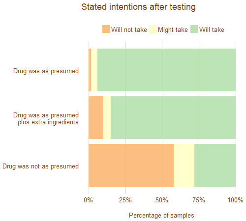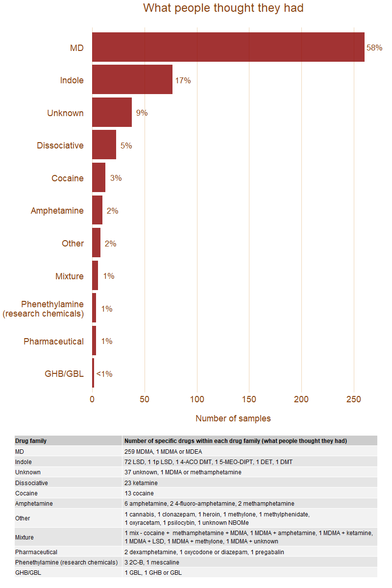 For the 2017/18 summer, 21% of the drugs that our clients had were not what they expected. Just over half of these were something completely different, about a quarter had the presumed substance plus extra ingredients, and the rest could not be conclusively identified.
