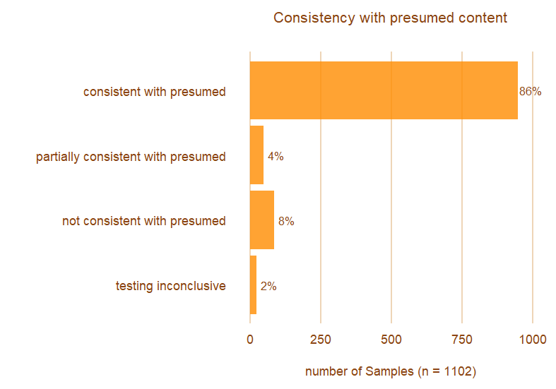 This year, 86% of the substances tested consistently with what clients thought they were. This is a similar result to last year and an increase on previous years.
