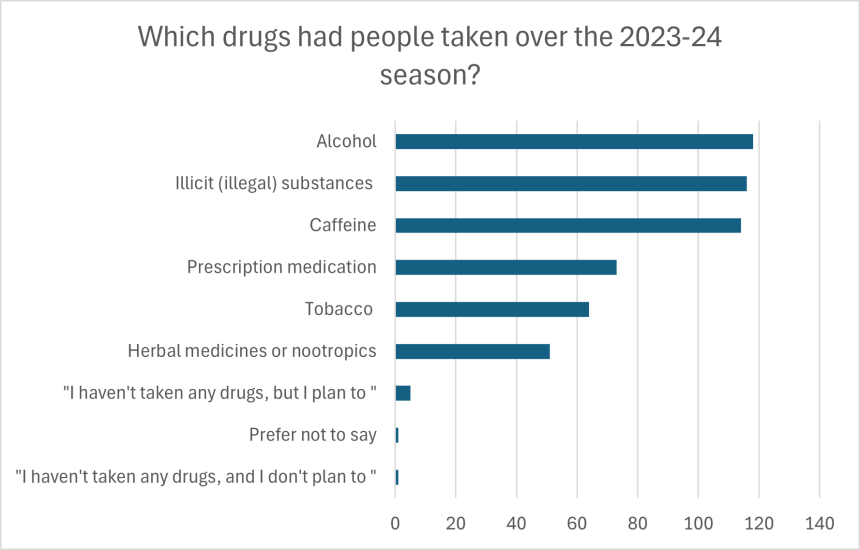 Alcohol was the most popular drug of choice for people that took our survey, followed very closely by illicit substances and caffeine. Only one person said that they had not taken drugs in the 2023-24 season and didn’t plan to.