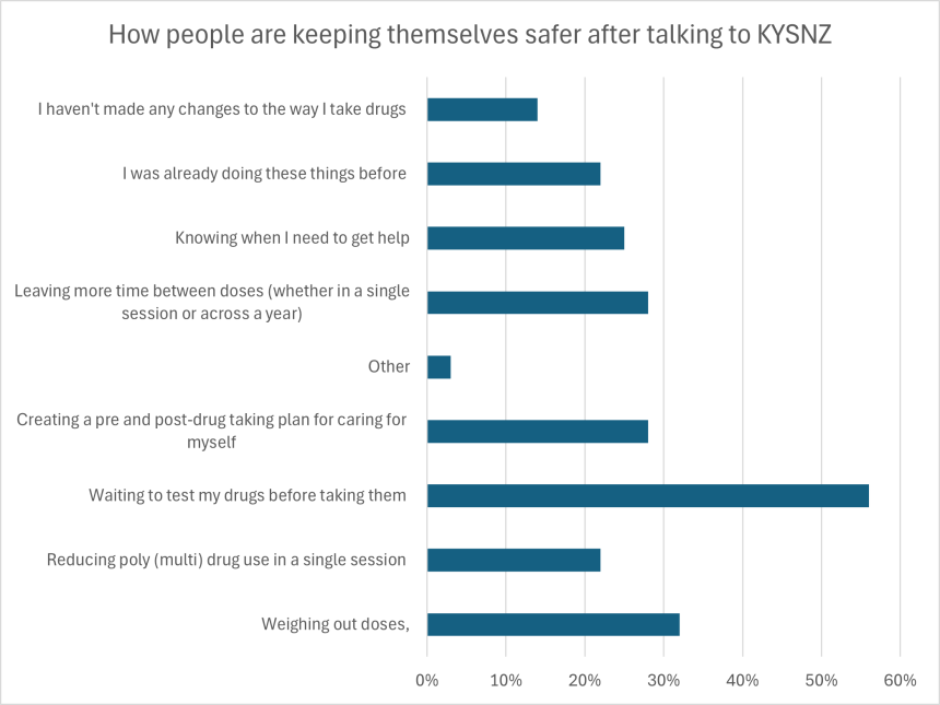 Most respondents had one method of harm reduction as a result of talking with KYSNZ, which was mainly getting their drugs tested before taking them. The most common harm reduction method combinations were getting their drugs tested before taking them and weighing out their doses. Reducing polydrug use and making sure they had a pre- and post- care plan also rated highly when more than one method was used.