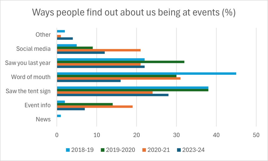 Word of mouth, having a visible presence at events, and clients expecting our presence after using our services in previous years remain the main way people find us at events. It is interesting to note that social media and event information have increased in use since the law change in 2021.