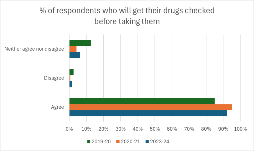 The trend of the majority of people checking their drugs before they take them continues this year. This could be due to increasing public awareness around drug substitution and the risk profiles of drugs currently in circulation.