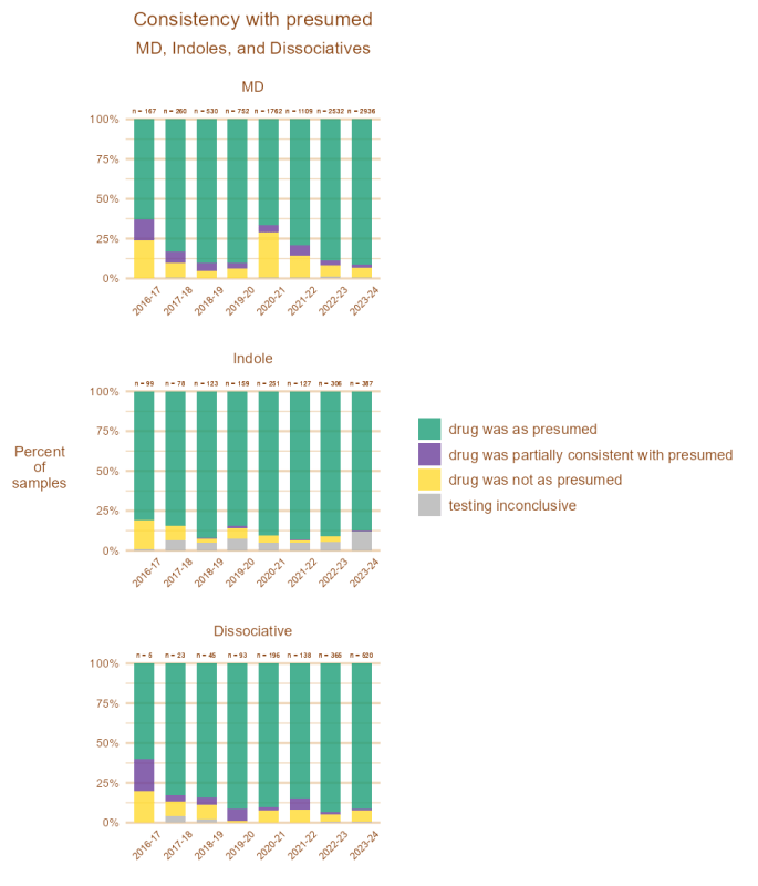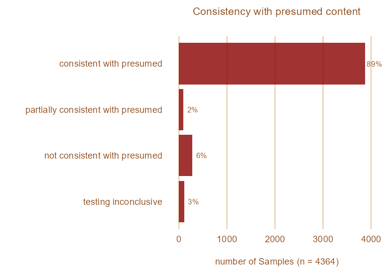 6% of samples were not consistent with what clients thought they had. 2% of samples were partially consistent with what clients thought they had. These samples usually contained the presumed psychoactive plus additional psychoactives, or non-psychoactive substances that can cause harm.
