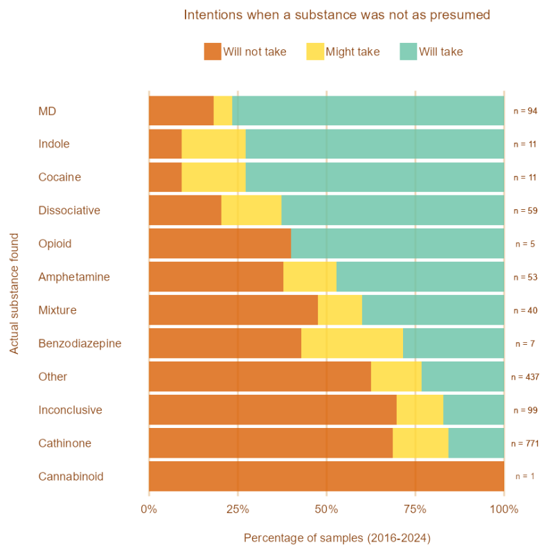People find some substances more desirable than others. We collated our results for samples that were not as presumed across all years of operation and found that people’s intention to take or not take a substance is highly dependent on the type of substance found.69% of people won’t take substances that turn out to be cathinones, and 70% won’t take substances where the test was inconclusive.