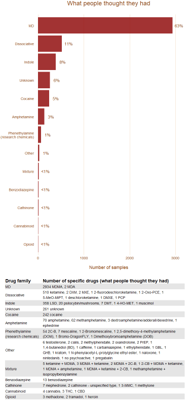 The most common substance found was MDMA, which represented more than half of the substances. The next most common were dissociatives (largely ketamine) and indoles (largely LSD).
