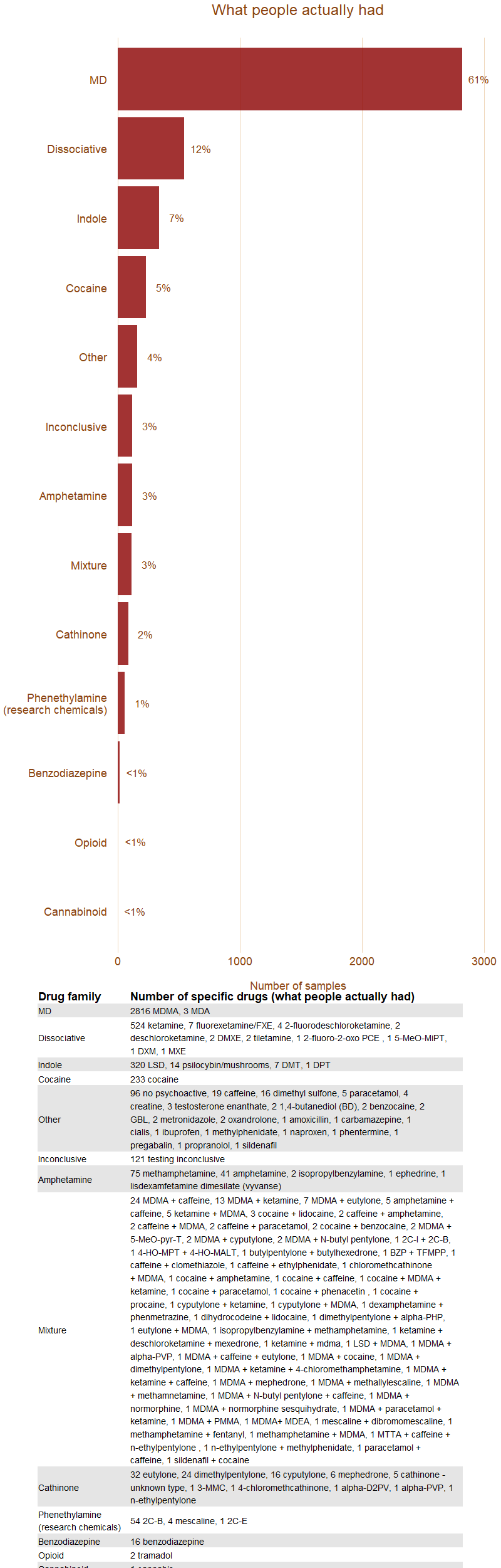 This is consistent with previous years. The proportions of families of other substances people thought they had are also consistent with last year. Note that some substances commonly used at events are not tested. We don’t need to test alcohol as it is a regulated drug with a safe supply. Cannabis or other plant materials are difficult for us to test with the equipment we have.