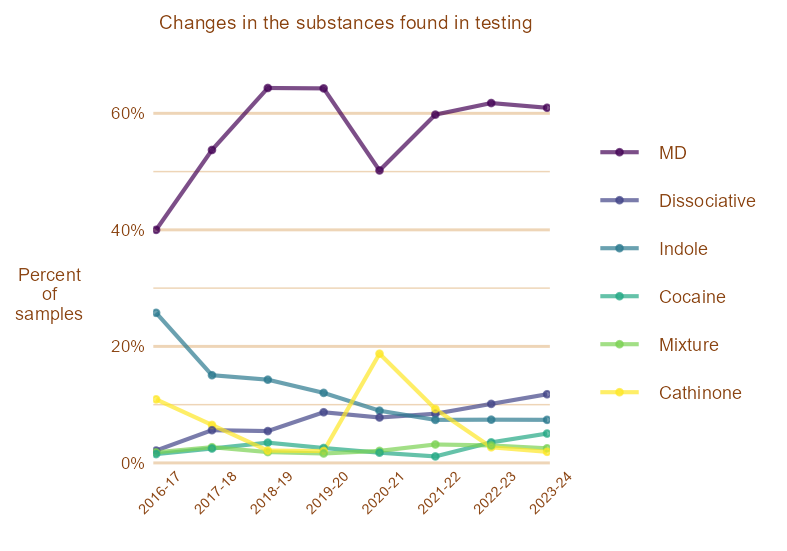 MD-family substances (such as MDMA and MDA) remain the most commonly found substance in our testing. We have observed a small but steady increase in the number of dissociatives and cocaine found this year, and a slight decrease in the number of cathinones.