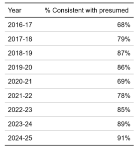 The proportion of indole and dissociative-type substances that are consistent with presumed has remained fairly stable across the past six years. Dissociatives have ranged between 83% and 93% consistent with presumed (93% in the 2024/25 season) and indoles between 84% and 93% (89% in the 2024/25 season) consistent with presumed.