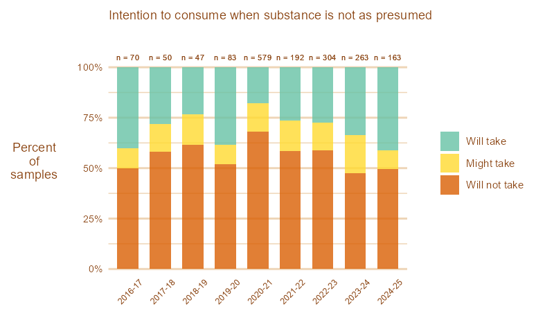 - Are people becoming more or less likely to take substances that aren’t what they were purchased as?
