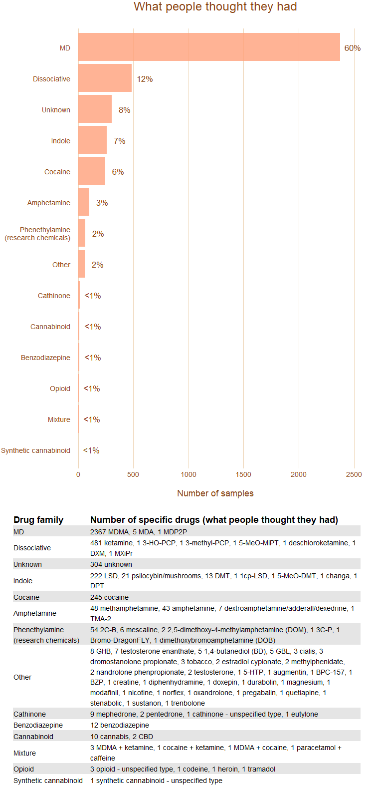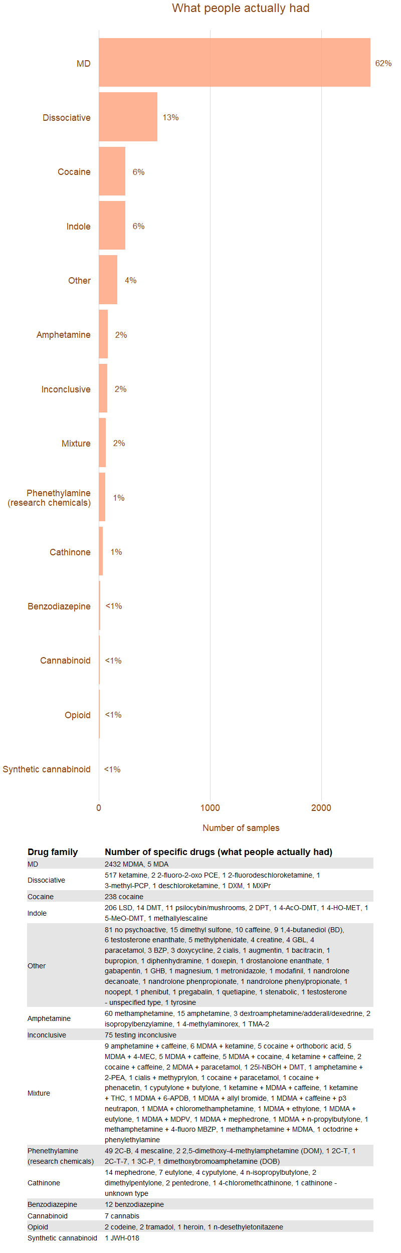 The most common substance found was MDMA, which represented almost two-thirds of all substances. The next most common were dissociatives (largely ketamine), cocaine, and indoles (largely LSD).