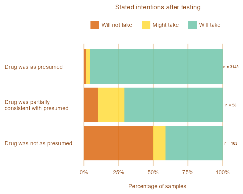 - 68% said that they intended to take it because they considered the found substance to be desirable. Most of these were cases where testing showed that the substance was MDMA or ketamine.