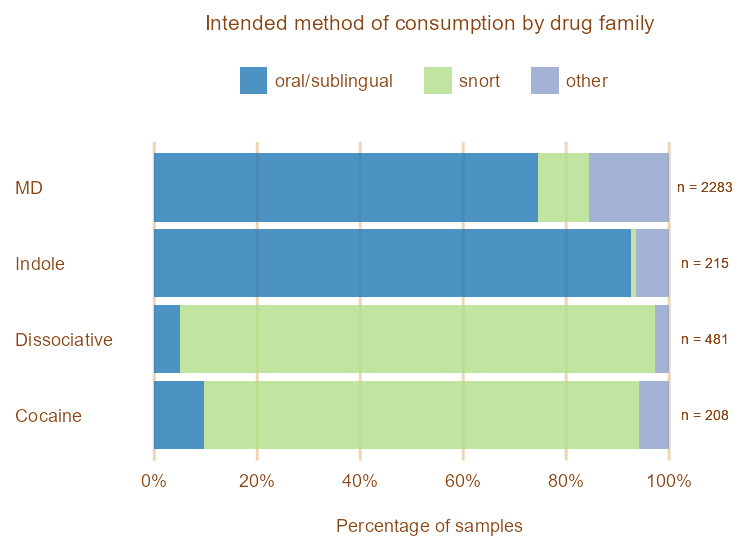 We advise clients that oral/sublingual is the least risky route of administration for MDMA. Other substances, such as ketamine and cocaine, are most commonly snorted. These results have remained consistent across years.