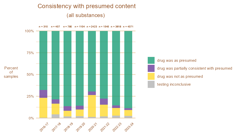 These reports contain information on all substances we tested over the year by presumed and actual, as well as changes over time, and information on how people choose to consume them.